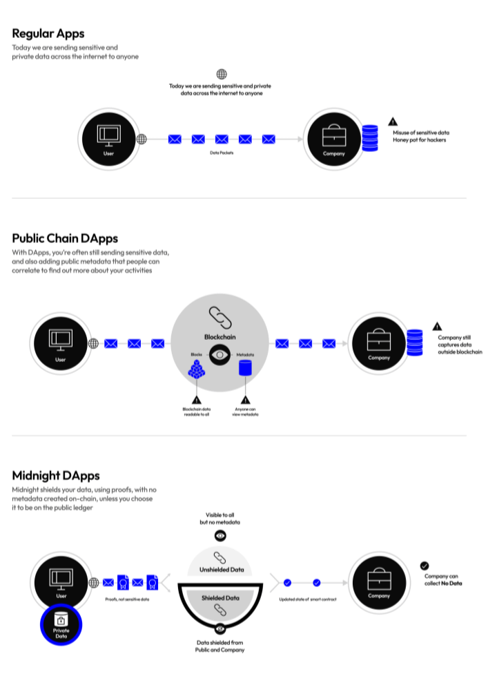 A diferencia de otras blockchains públicas, que exponen cada elemento, Midnight puede proteger datos y metadatos, permitiendo a las empresas proteger a sus clientes sin comprometer la seguridad de datos sensibles ni divulgar actividades.
