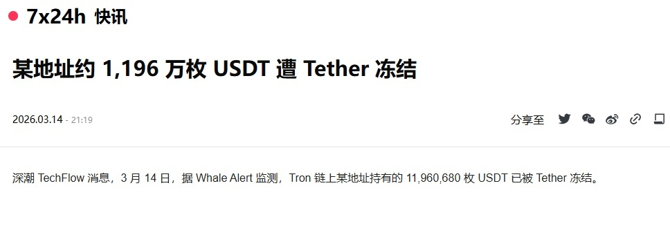 据 Whale Alert 监测,Tron 链上某地址持有的 11,960,680 枚 USDT 已被 Tether 冻结。作为一个在币圈惊涛骇浪里被反复拍在沙滩上、骨灰都被扬了好几次的“老资深小韭菜”,本盗看完这消息,心里那叫一个五味杂陈。1,200 万美金啊,说封就封,连个商量的余地都没有。