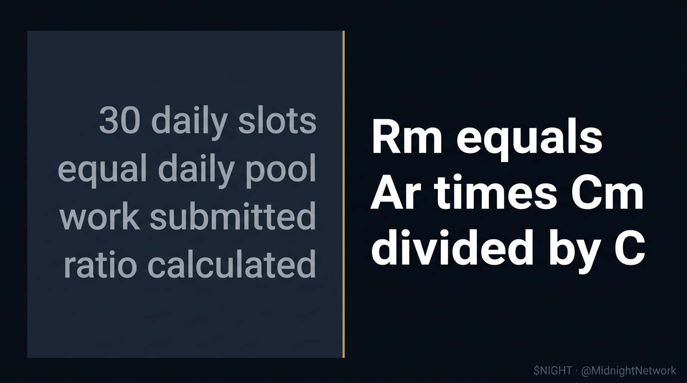 heres the exact formula from the whitepaper. let Ar be the total tokens apportioned as rewards to Scavenger Mine participants on a given day. let Cm be the share of computation that a specific participant m provided. let C be the total computation completed by all participants that day. then the reward Rm for participant m is: