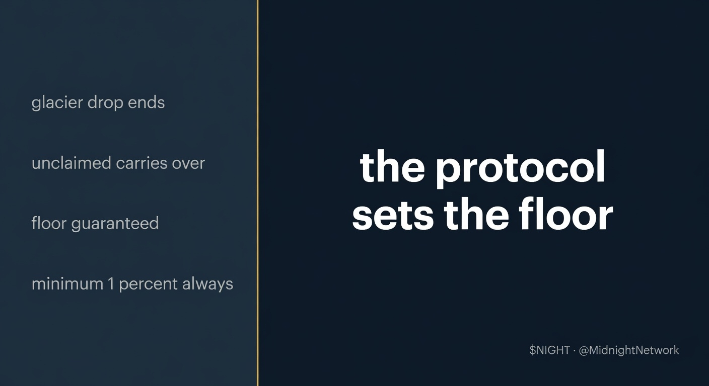 there is one floor built into the system. regardless of how much was claimed during Glacier Drop, a minimum of 1% of the total NIGHT supply is guaranteed to be available for Scavenger Mine participants. the protocol sets that floor so that even if Glacier Drop was wildly successful and left very little unclaimed, Scavenger Mine participants still have something meaningful to compete for.