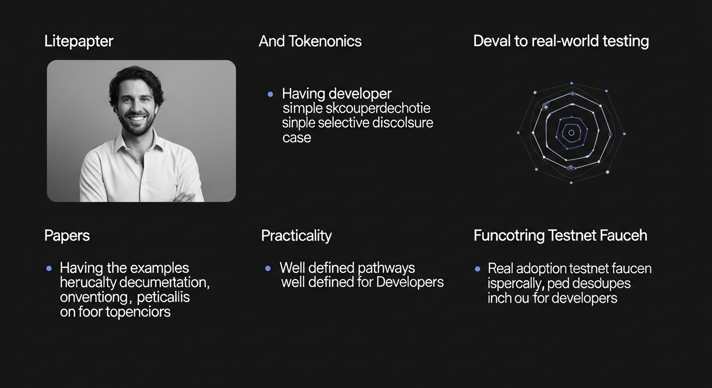 Entender el proyecto para mí requería un enfoque práctico. Habiendo revisado el litepaper y los materiales de tokenomics, me sumergí en la documentación para desarrolladores y exploré un caso simple de divulgación selectiva. La practicidad, ejemplos de código, un grifo de testnet funcional y caminos bien definidos para los desarrolladores realmente captaron nuestra atención. La adopción real depende más de tal experiencia del desarrollador que de cualquier comunicado de prensa.