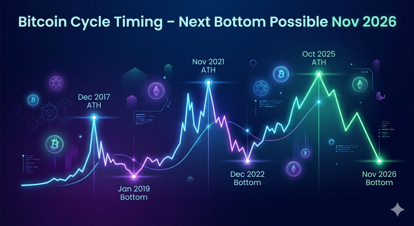 • Possible Oct 2025 ATH → ~395 days → Potential Bottom near Nov 2026