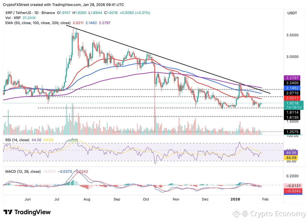 Traders identify $1.90 as the immediate technical floor, an area the asset tested repeatedly since late 2025. The current range marks a consolidation phase after XRP pulled back from peaks near $2.00 recorded in early January.