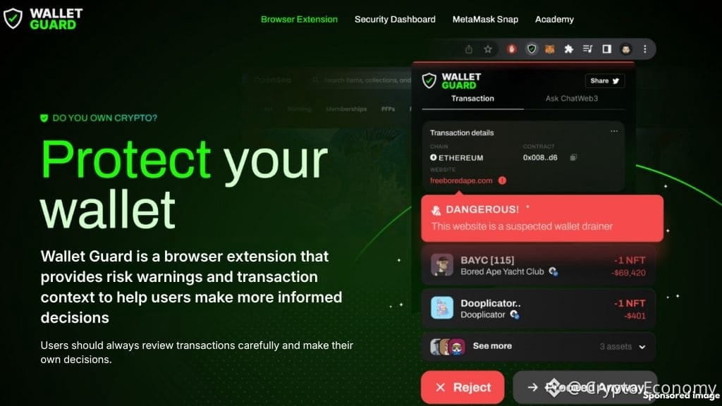 Wallet Guard maintains an actively updated phishing database and integrates alerts directly into the browsing experience, blocking access before interaction occurs.