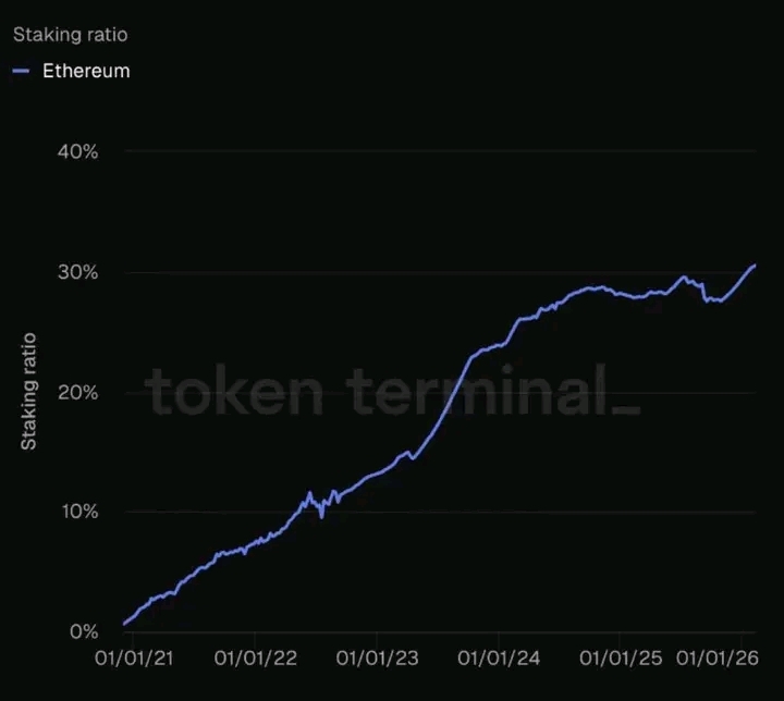 For the first time in the network’s history, the staking ratio on Ethereum has surpassed 30% of the total supply, according to Token Terminal data 📊
