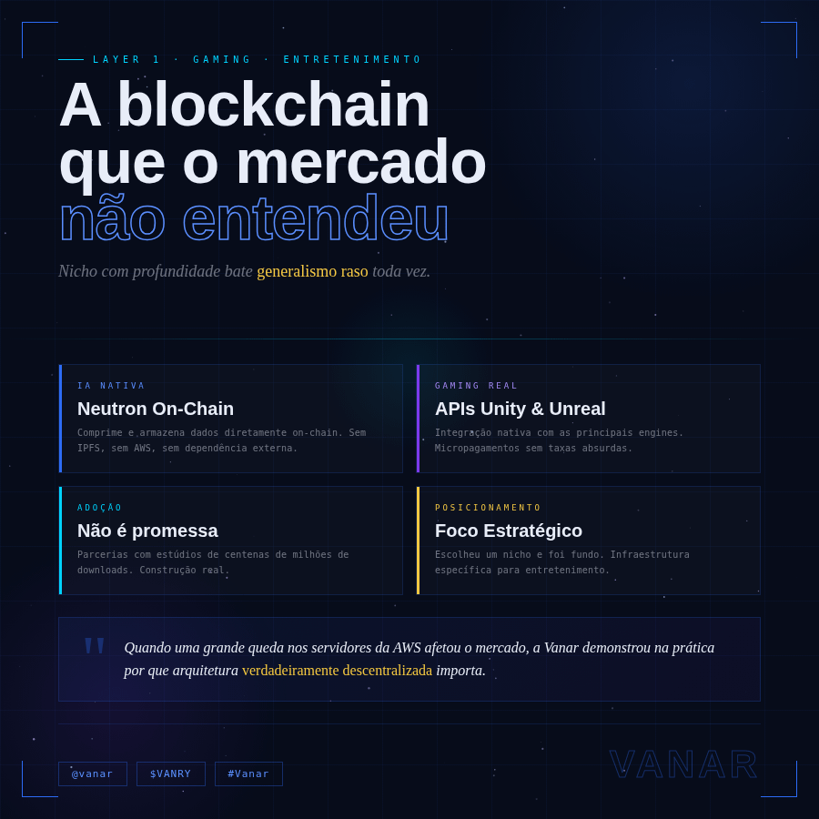 O que mais me interessa aqui é o posicionamento. A maioria das blockchains tenta ser tudo para todos. A Vanar escolheu um nicho entretenimento e gaming e construiu infraestrutura real para ele. Essa escolha tem valor. Nicho com profundidade bate generalismo raso toda vez.