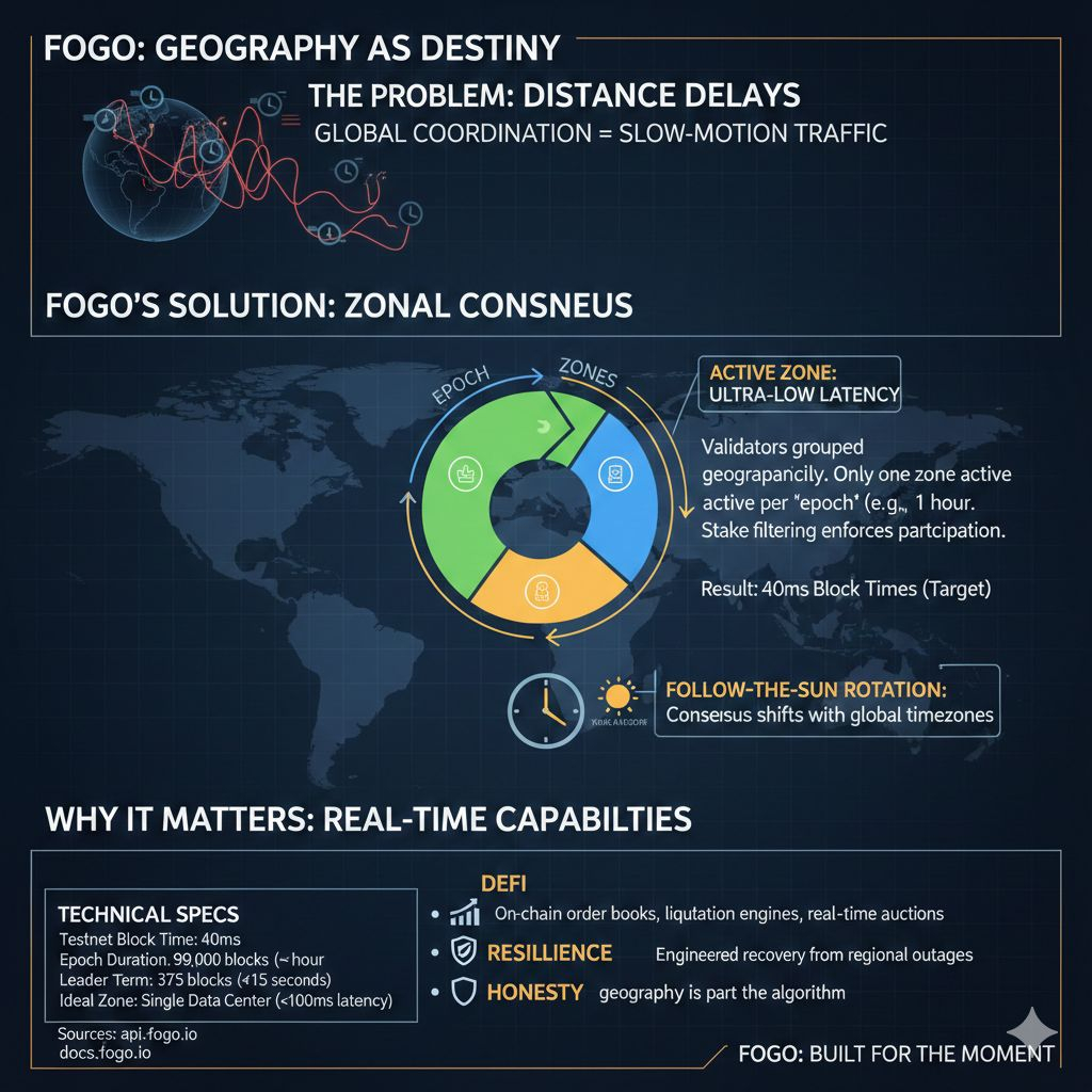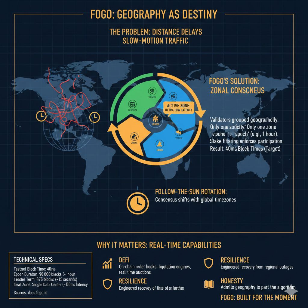 So when I looked at Fogo, I didn’t care that it uses the Solana Virtual Machine. SVM compatibility is nice, sure, but it’s not a personality. What grabbed me was this: Fogo treats geography like a design constraint, not an inconvenience it can benchmark away. It builds consensus around the fact that the planet is large and your packets don’t teleport.