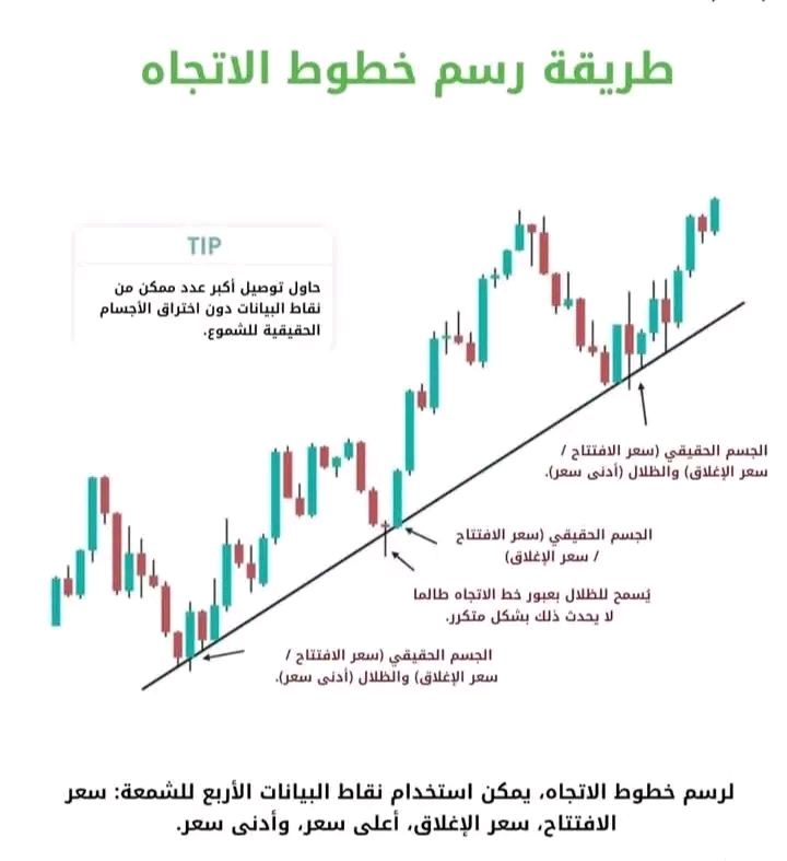 الاتجاه (Trendline) ليس مجرد شخبطة عشوائية، بلهو "خط سير السعر". الكثير يقعون في فخ الرسم الخاطئ وتضيع عليه فهمالشارت...اولا لازم تعرف ان للشمعة سعر اغلاق وسعر افتتاح وهي مربط الفرس في عمليةالرسم للخطوط. وبالتالي عندما ترسم الخط انتبه تقطع جسم الشمعة...