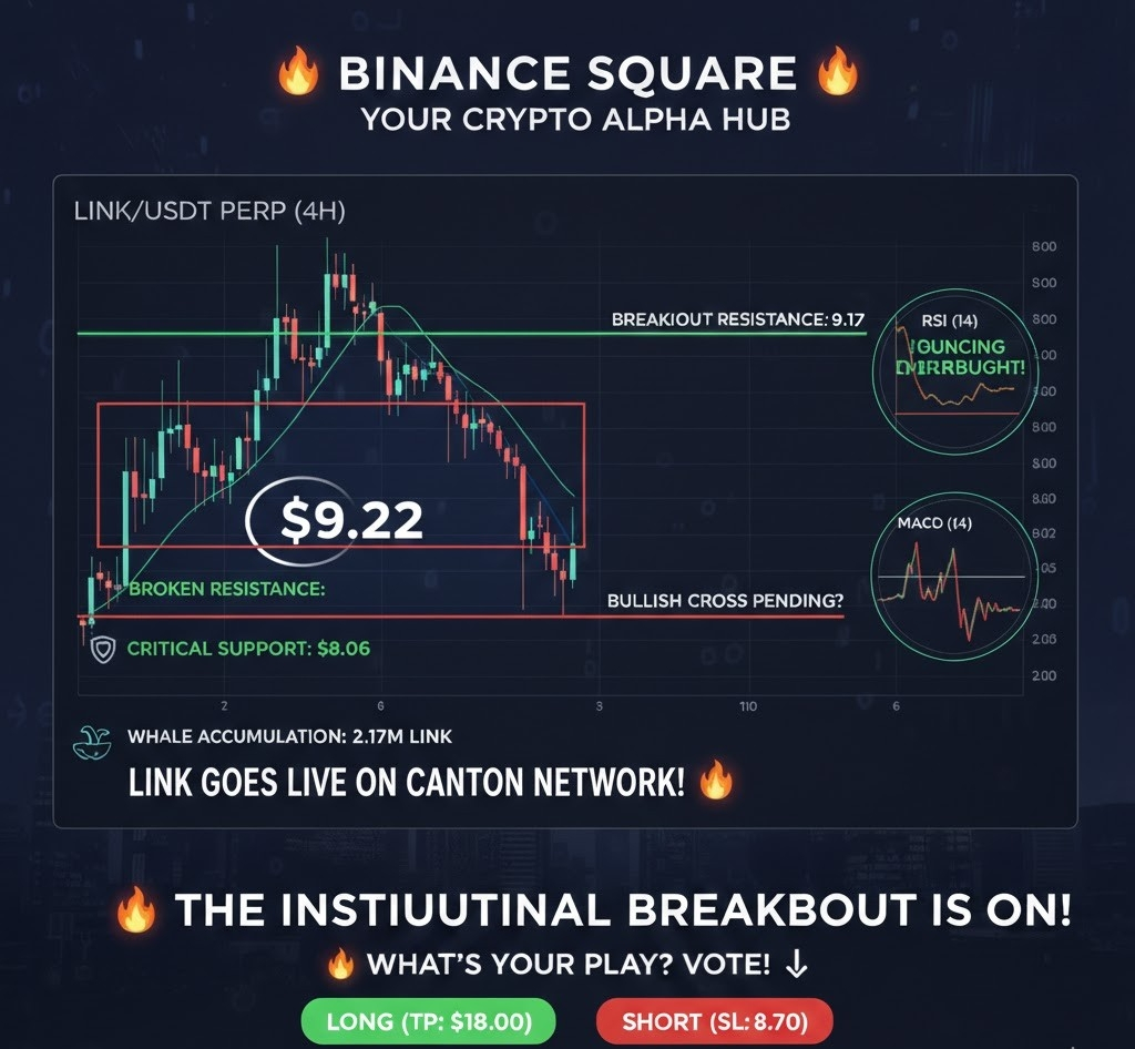 Price Action: $LINK is oscillating in a defined "Accumulation Zone" between $8.20 and $9.15. It recently held the $8.17 low with high-volume absorption, indicating whale interest at these discount levels.
