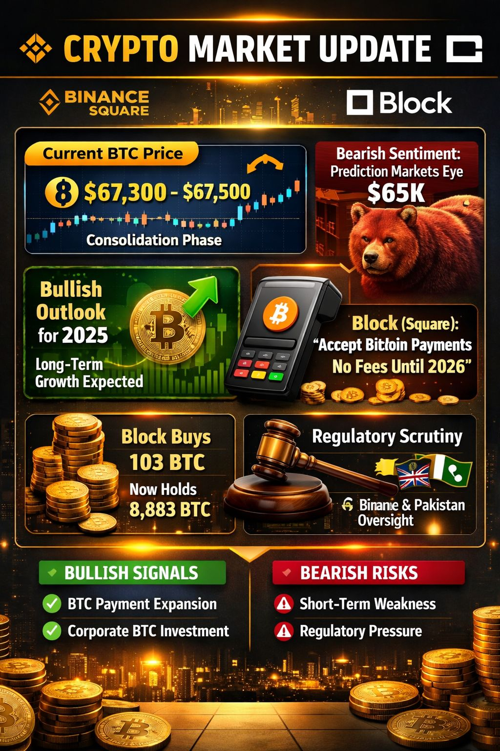 Recent Binance Square post notes that Bitcoin (BTC) is in a consolidation range around roughly $67,100–$67,500 after a rebound from lows. BTC had previously rebounded up toward $70K but remains below its all-time highs. �