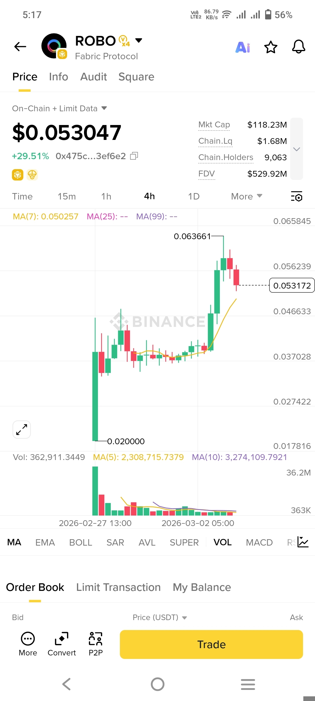 Looking at your chart, ROBO just popped to $0.053 (+29%) and the recent high on this leg is *$0.06366*. That level is the immediate ceiling.