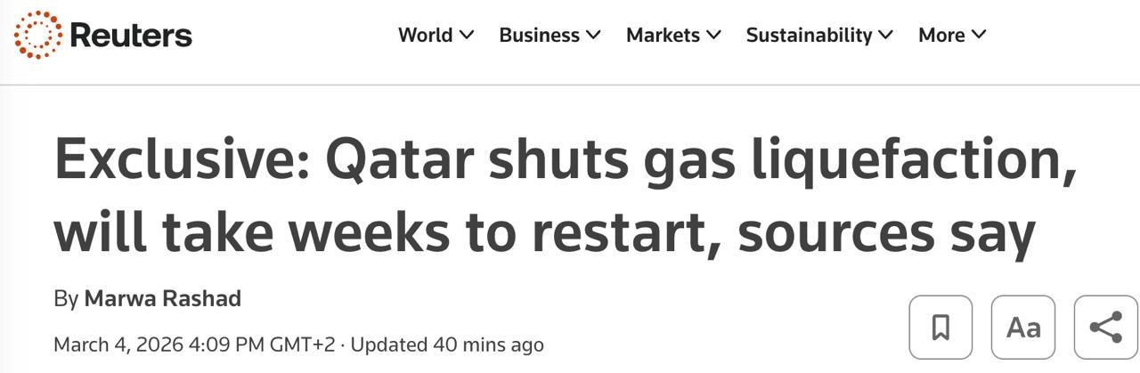 - Le Qatar met complètement fin à sa production de gaz liquéfié, Qatar Energy pourra commencer à gagner au moins dans un mois après les frappes de l'Iran, rapporte Reuters en citant des sources.