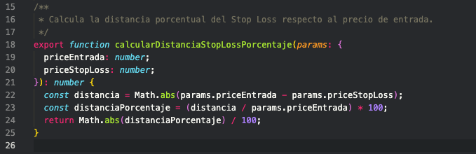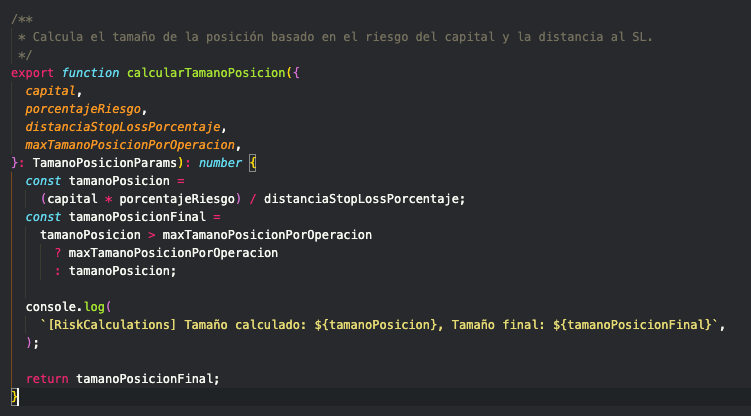 Este es justo el capital que estoy dispuesto a perder si el precio llega a mi SL; en código esto es mucho más complejo, te enseño las fotos al final.