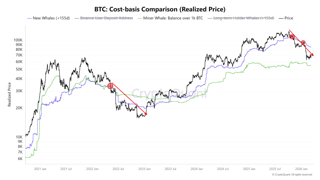 Les baleines qui détiennent des BTC depuis moins de 155 jours ont actuellement un coût de base moyen de 85,6K $.