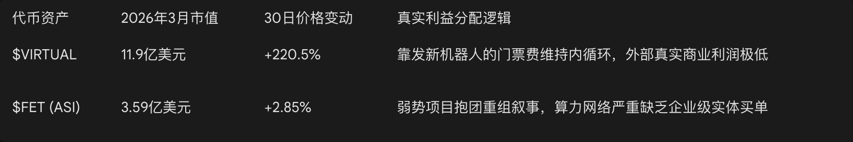 Base链上某巨鲸在2026年3月重仓2300万美元 AI Agent 代币,出清时因毫无真实买盘,账面瞬间血亏88.77% 。我们直接看透当前头部 AI 资产的底层数据: