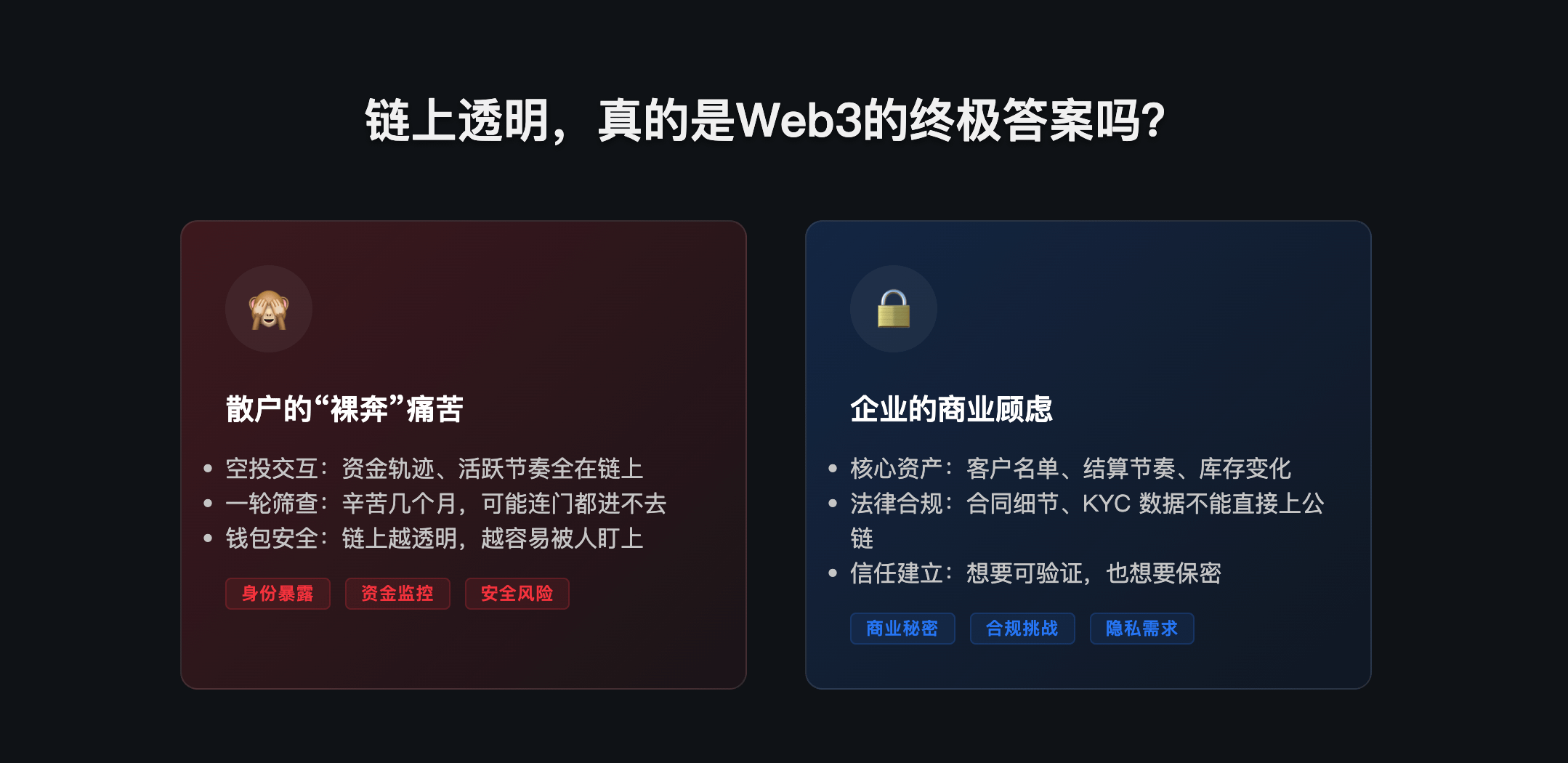 C'est le même pour les petits investisseurs, et pour les entreprises, ne parlons même pas, liste des clients, rythme de règlement, variations de l'inventaire, détails des contrats, qui oserait les mettre directement sur la blockchain publique.
