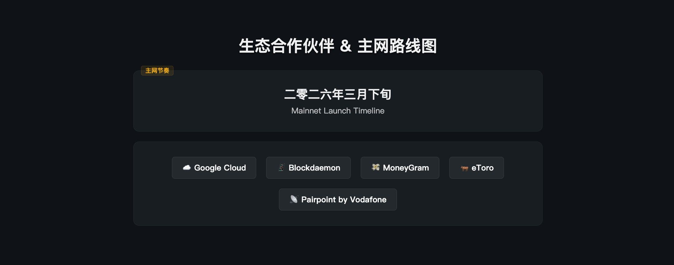 La page d'accueil officielle et les mises à jour récentes continuent d'avancer le rythme du réseau principal, le lancement du réseau principal est prévu pour la fin mars 2026, et parmi les partenaires de nœuds fédéraux, il y a déjà des noms comme Google Cloud, Blockdaemon, MoneyGram, eToro et Pairpoint by Vodafone.
