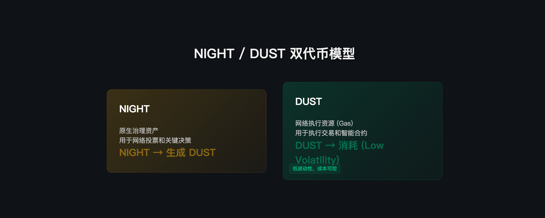 $NIGHT est l'actif de gouvernance natif du réseau, DUST est la ressource utilisée lors de l'exécution des transactions et des contrats, la possession de $NIGHT peut générer DUST.