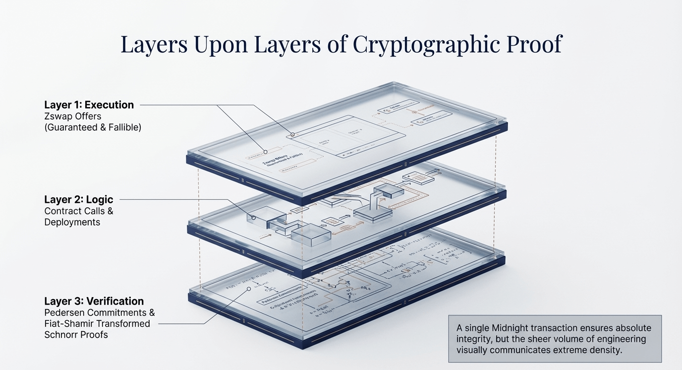 J'ai récemment pris le temps de lire la structure des transactions de Midnight. Et honnêtement, si quelqu'un de complètement nouveau dans la crypto lit cette documentation, il y a de bonnes chances qu'il ferme l'onglet à mi-chemin. Zswap propose, des transcriptions garanties, une exécution faillible, des engagements de Pedersen, des preuves à connaissance nulle… des couches sur des couches.