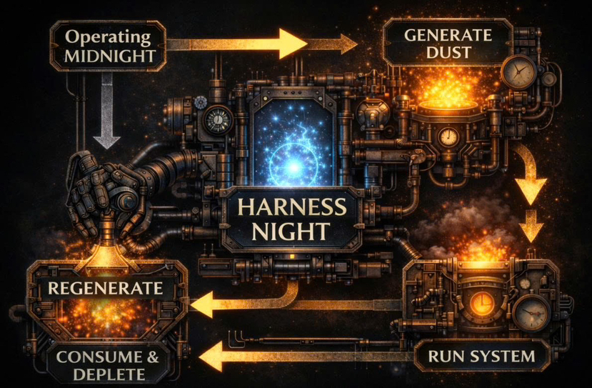 The mechanism to create DUST is extremely simple: Holding Night, the system operates and generates DUST, DUST is used to maintain and be consumed and continue to regenerate. Do you realize it? the way I call NIGHT the spinal marrow and DUST the bloodstream is like that.