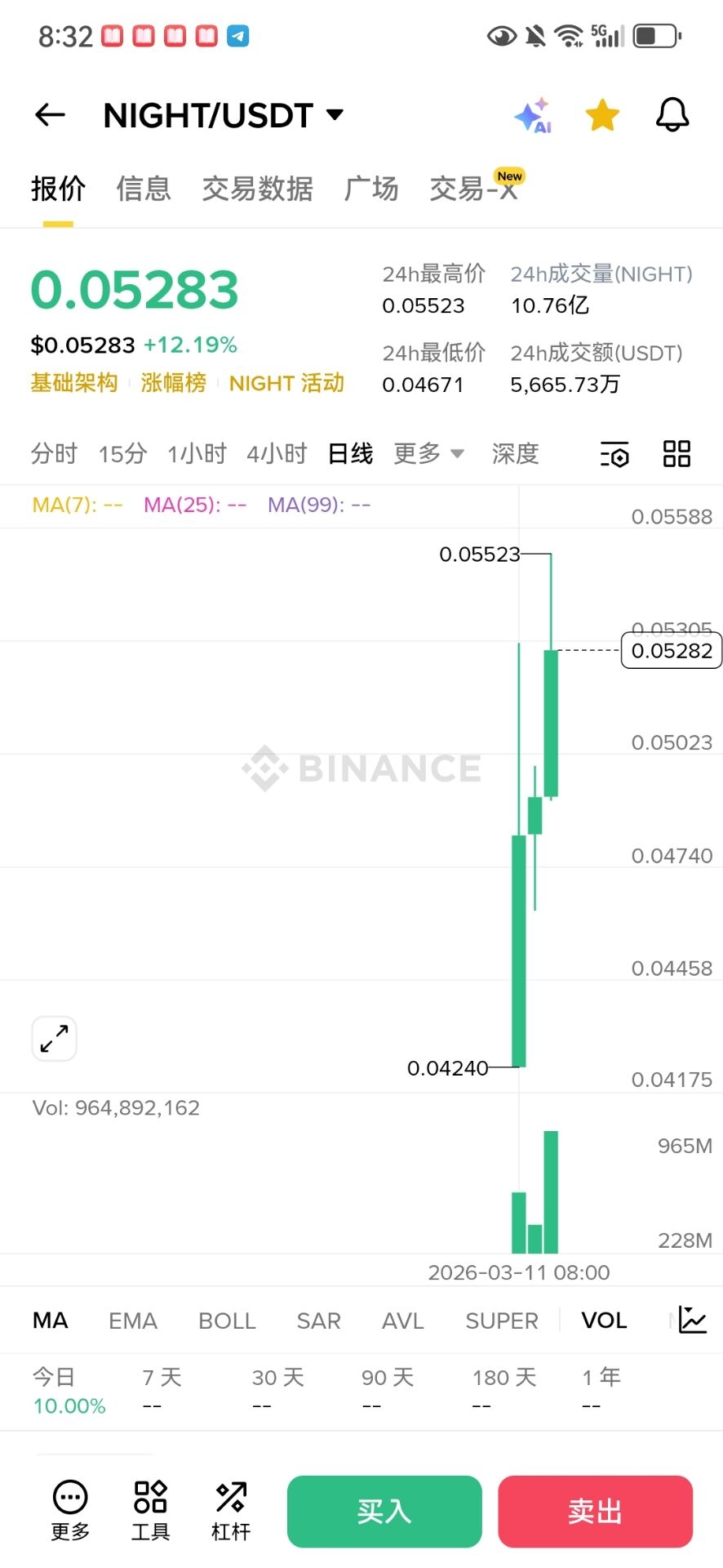 En ce qui concerne le moment d'entrée, j'ai délibérément choisi une période matinale relativement calme sur le marché. À ce moment-là, le prix le plus bas de NIGHT sur 24 heures a touché 0,0424 USDT, le prix se stabilisant autour de 0,045, avec un volume de transactions qui n'avait pas encore nettement augmenté, évitant ainsi les risques d'achat à la hausse tout en laissant suffisamment d'espace pour le mouvement ultérieur du marché. Pour moi, c'est plus comme une "expérience avec une petite position" : utiliser un petit capital pour valider la logique du projet tout en affinant mon rythme de trading, car dans le marché des cryptomonnaies à forte volatilité, être en vie est plus important que de réaliser des bénéfices rapides.