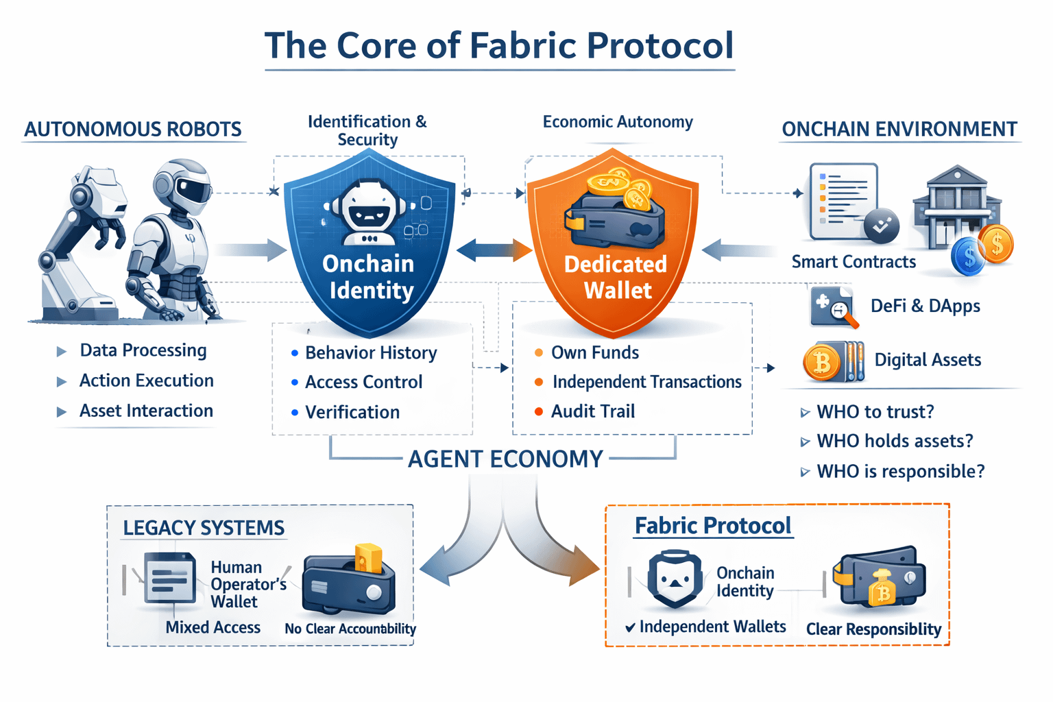 One night, I sat watching a cluster of agents lining up to sign transactions, and I understood why Fabric Protocol touches the very core of this story. When robots begin to read data on their own, choose actions on their own, and directly interact with assets, what is missing most is no longer speed, but an onchain identity clear enough, and a wallet private enough, for the network to know who is doing what.