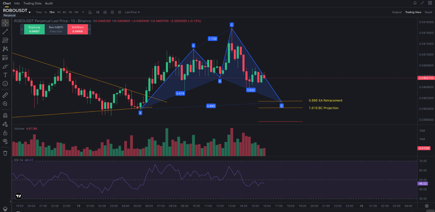 The current structure on the $ROBO perpetual chart on Binance is approaching a potential harmonic completion zone, creating a possible intraday long setup.