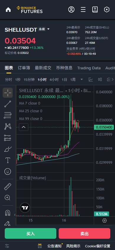 4H级别,$SHELL在3月15日20:00-24:00(UTC)完成关键突破。Fact:该时段K线实体从0.03314拉升至0.03599,涨幅8.6%,成交量激增至5.85亿,是前一小时的340倍以上,买/卖比率0.5显示多空激烈换手。Logic:价格一举突破0.032-0.033的长期盘整区间上沿及EMA50(0.0305),伴随天量成交,这是主力资金进场的明确信号,非散户行为。