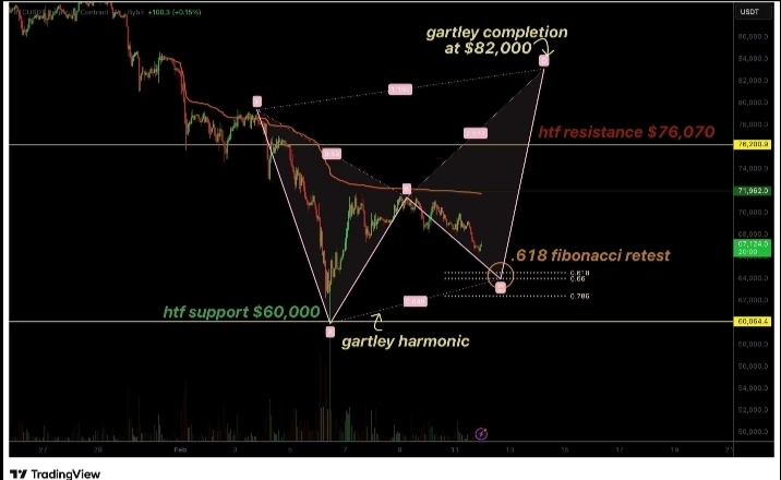 Dari perspektif teknis, aksi harga, dan struktur pasar, Bitcoin mendekati titik keputusan kunci. Mempertahankan di atas dukungan Fibonacci 0,618 menjaga struktur harmonik Gartley utuh dan melestarikan probabilitas reli menuju zona target $80.000-$82.000.