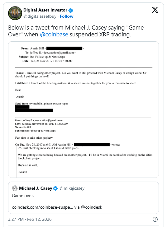 $XRP Email Epstein yang baru saja dirilis memberikan konteks baru untuk perkembangan blockchain menjelang gugatan XRP. Komentator kripto terkemuka Digital Asset Investor membagikan email yang menunjukkan Austin Hill, seorang pengusaha blockchain Kanada dan salah satu pendiri Blockstream, berkomunikasi dengan Jeffrey Epstein dan Michael J. Casey pada November 2017.
