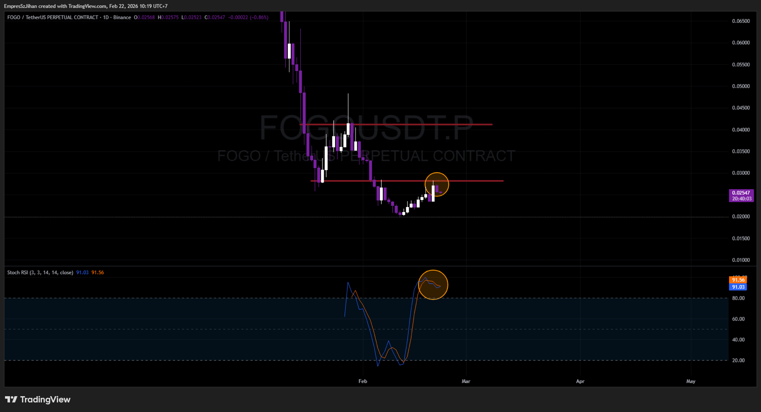 $FOGO is currently trading around $0.026–$0.027 (as of Feb 22, 2026), showing strong weekly gains of ~12–16% but facing stiff resistance at $0.02800 — the recent swing high zone from the past few days.
