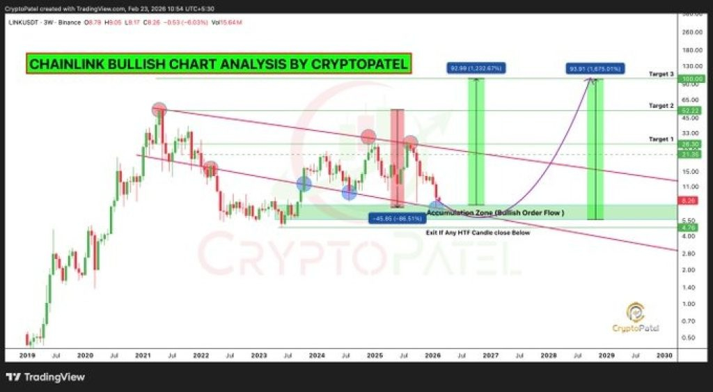 Crypto Patel berbagi di X bahwa analisis grafik 3 minggu yang mendetail menjelaskan mengapa dia berpikir LINK bisa bersiap untuk terobosan besar. Target jangka panjangnya? $26, $52, dan bahkan $100.