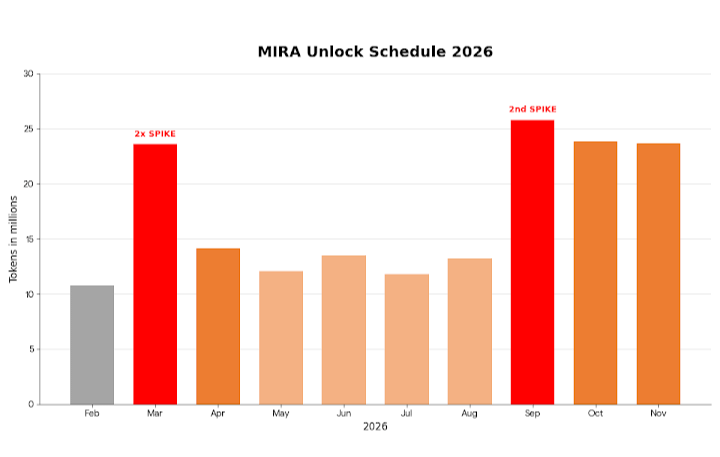 the unlock schedule doesn't give breathing room. today — Feb 26 2026 — 10.79M tokens unlock. $954K worth. two allocations hitting simultaneously. March 26: 23.6M tokens. $2.08M. more than double today's unlock in a single month. April through August runs at 11 to 14M monthly. September 26 brings the second major spike — 25.82M tokens across five allocations at once. October and November follow with 23M+ each. 38 unlock events still ahead in total.