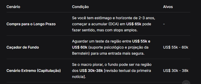 Nem todo mundo é tão pessimista. A corretora Bernstein tem uma visão diferente. Para eles, o fundo do ciclo já pode ter sido formado perto dos US$ 60.000, e acreditam que 2026 será um ano de recuperação . Eles argumentam que a demanda institucional (ETFs, tesourarias corporativas) está mudando a estrutura do mercado, tornando os ciclos menos voláteis.