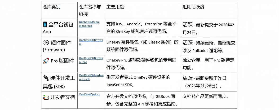 OneKey 践行其“100% 开源”承诺的核心代码库均托管在 GitHub 上。在网上差了一些资料,整理了一个表格,有兴趣的朋友可以看一下。