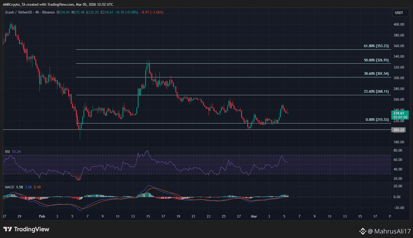 Following the broader stabilization near the demand base, the lower timeframe revealed how the recovery has been unfolding structurally. On the 4-hour timeframe, Zcash defended a tighter support cluster between $232 and the Fibonacci baseline near $215.