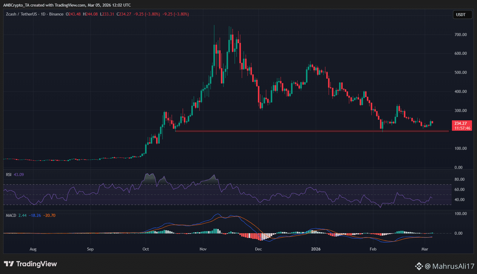 Zcash [ZEC] has continued stabilizing after the broader decline from peaks above $700, gradually compressing towards a critical support region near $200. Initially, persistent selling pressure drove the price steadily lower through December and January, reinforcing the prevailing bearish structure.