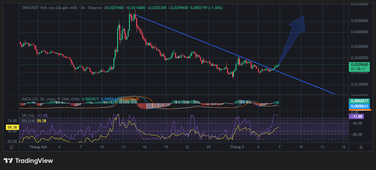 Mô hình "Cái nêm giảm" (Falling Wedge) bứt phá: Trong khi thiên hạ lo sợ, $TAKE đã âm thầm tích lũy và thực hiện cú Breakout cực kỳ uy tín ngay tại vùng hỗ trợ cứng.