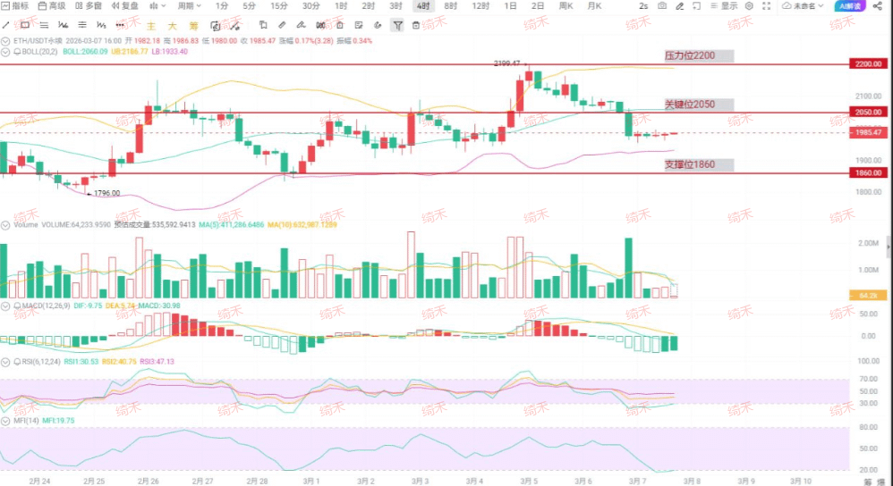 2. 关键点位:图上标得清清楚楚。上方最近的压力是2050(关键位)和2200。尤其是2050,它既是布林带中轨,也是前期一个心理关口,能不能放量突破上去,是多空扭转的第一个标志。下方的支撑先看1860