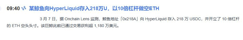 就在今天早上,链上监测逮到一条大鲸鱼!地址“0x218A”一口气往HyperLiquid存了218万U的USDC,开了10倍杠杆直接做空ETH。关键是,这哥们儿不是新手,历史战绩显示他已经赚了超过1180万美金。