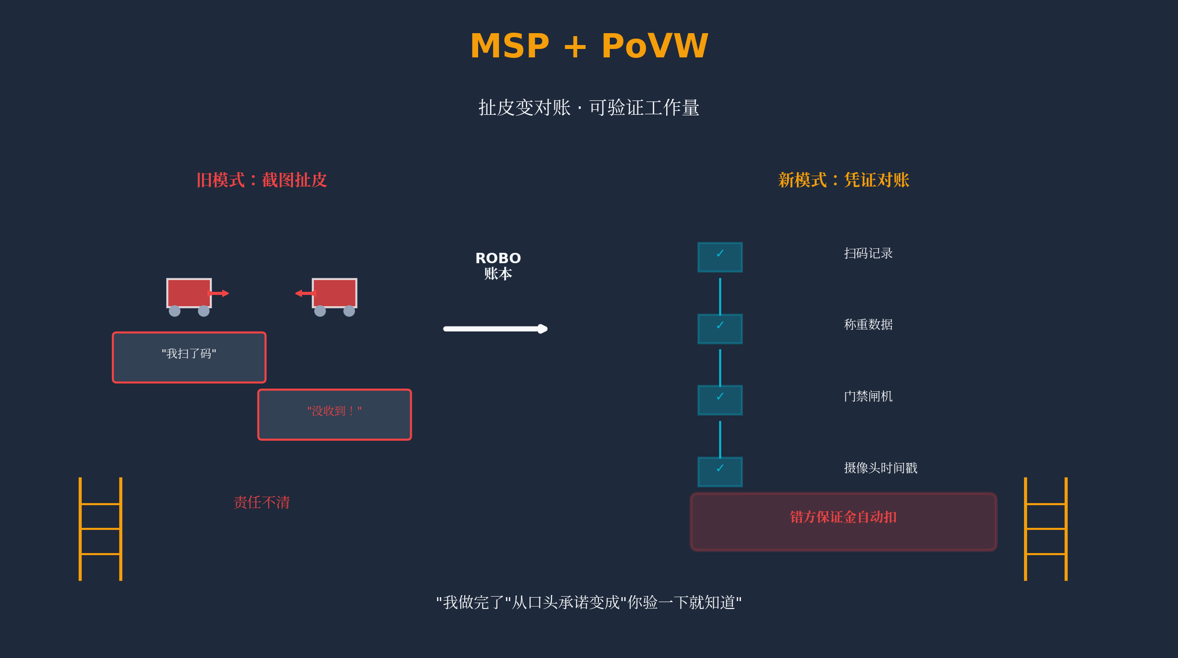 但仓库里真正会吵起来的,从来不是"能不能跑",而是"出了事谁背锅"。包裹少扫一次码、交接少签一次名,第二天就是一场推来扯去的拉扯。ROBO的MSP(机器结算协议)在我看来像把"扯皮"变成"对账":扫码、称重、门禁闸机、交接签收、摄像头时间戳这些记录,不再只是截图,而是能触发冻结付款、判责与理赔的凭证。错在谁那边,就从谁押着的保证金里扣,事件还会留下痕迹,影响之后的接单成本。
