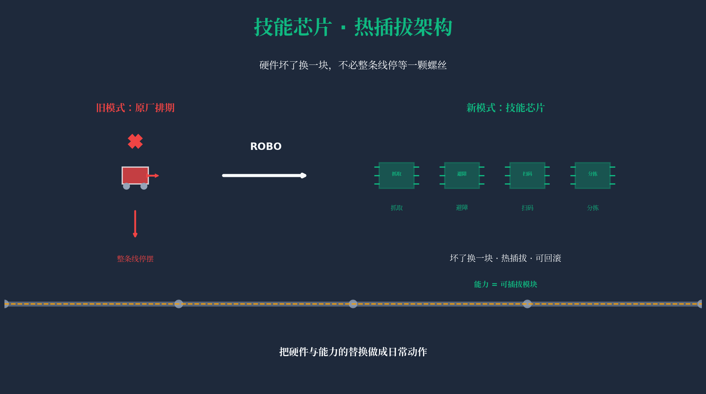 第二个让我觉得"能跑起来"的点,是ROBO把硬件与能力的替换做成日常动作。仓库里最怕的不是机器人坏,是坏了就得回原厂排期,整条线跟着停。ROBO这套系统更像把能力做成可插拔的"技能芯片":抓取策略、避障策略、扫码/分拣模块都能热插拔、能滚版本、能回滚,坏了换一块,不必整条线停下来等一颗螺丝。