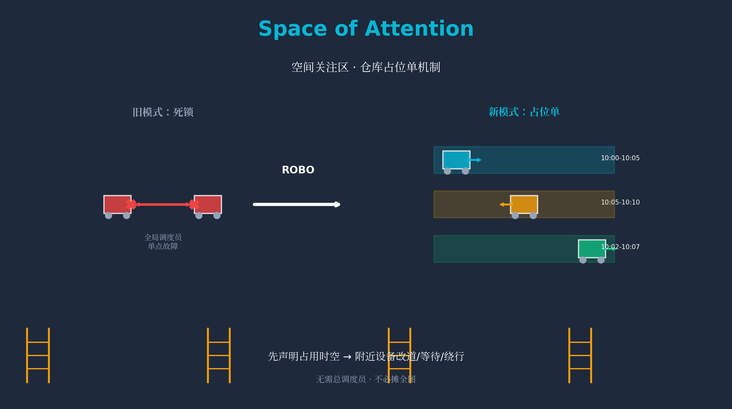 最先让我服气的,是ROBO把"路权死锁"当成现场问题来解。ROBO的Space of Attention(空间关注区)的思路很像仓库的占位单:每台车先声明自己接下来要占用的三维空间和时间窗,附近的设备据此改道、等待或绕行,不需要一个总调度员盯着全局,也不必把完整地图摊给所有人。窄道能不能过,先靠这张"占用声明"把冲突压下去。