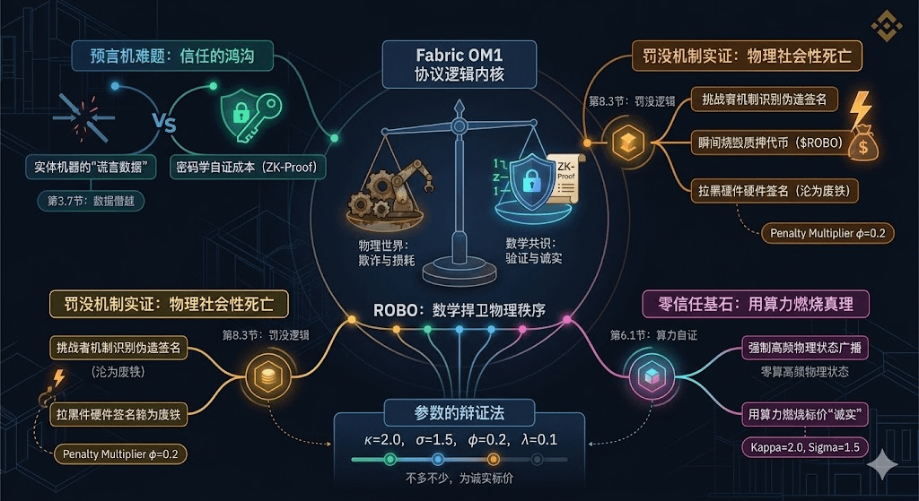 Dalam hukum jaringan mesin yang dibangun oleh Fabric, kerja fisik yang benar-benar terjadi, jika tidak melalui pelanggaran kriptografi yang sangat ketat, akan setara dengan ketiadaan di mata sistem. Untuk menjembatani kesenjangan antara buku besar digital dan dunia fisik yang kasar, protokol memperkenalkan bukti nol-pengetahuan yang sangat menghabiskan sumber daya komputasi dan mekanisme yang dapat memverifikasi status fisik. Ini berarti bahwa mesin fisik yang terhubung ke jaringan tidak hanya harus menghabiskan energi listrik yang sangat mahal untuk menyelesaikan pekerjaan perakitan, pembersihan, atau transportasi di dunia nyata, tetapi juga harus ekstra menghabiskan banyak daya komputasi untuk mengemas dan mengompresi setiap jejak gerakan sendi fisiknya, setiap data lingkungan dari sensor, menjadi bukti kriptografi yang sama sekali tidak dapat dipalsukan. Sistem memaksa setiap kehidupan berbasis silikon yang mencoba menghasilkan keuntungan di ekonomi ini untuk membayar biaya pembuktian diri yang sangat tinggi untuk kejujurannya.