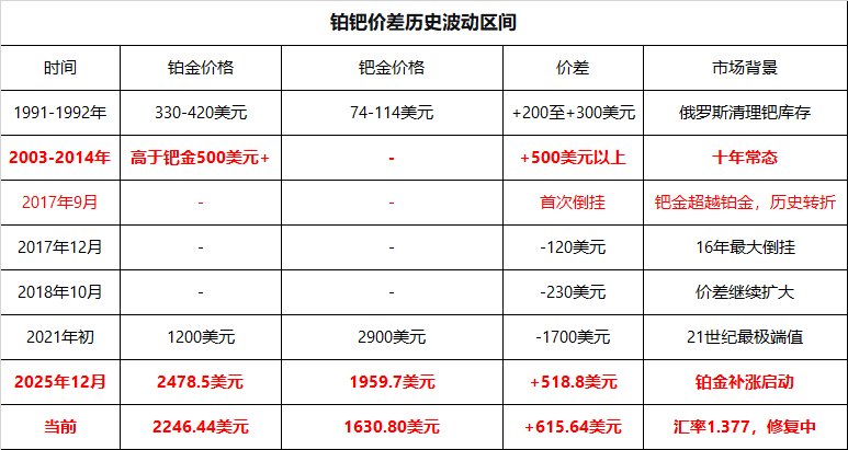 ### 二、铂钯价差:从-1700到+600的极限回归