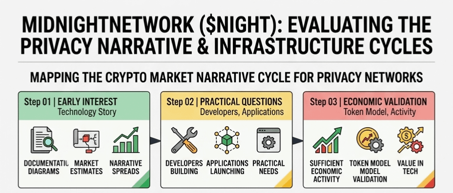 Namun, jaringan privasi secara historis menghadapi serangkaian tekanan yang unik. Pemerintah dan regulator sering memperlakukan enkripsi yang kuat dan alat keuangan anonim dengan hati-hati, terutama ketika pengawasan keuangan dan aturan anti-pencucian uang terlibat. Ketegangan itu telah membentuk lintasan banyak proyek privasi selama dekade terakhir. Beberapa jaringan berjuang untuk mempertahankan daftar pertukaran, sementara yang lain merancang ulang arsitektur mereka untuk memungkinkan transparansi yang terkendali jika diperlukan. Midnight tampaknya sedang mengeksplorasi jalur tengah dengan fokus pada pengungkapan selektif daripada anonimitas penuh. Jika diterapkan dengan benar, desain itu dapat memungkinkan alat privasi berfungsi seiring dengan harapan kepatuhan tanpa sepenuhnya menghilangkan transparansi dari sistem. Dari perspektif pasar, narasi seperti ini cenderung mengikuti siklus yang sudah dikenal. Ketertarikan awal biasanya datang dari cerita teknologi itu sendiri. Trader membaca dokumentasi, memeriksa diagram arsitektur, dan mulai memperkirakan seberapa besar pasar potensial dapat menjadi. Jika konsep tersebut terhubung dengan tema yang lebih luas seperti privasi, keamanan data, atau infrastruktur blockchain modular, narasi menyebar dengan cepat di seluruh ekosistem. Namun narasi jarang bertahan selamanya. Akhirnya percakapan beralih ke pertanyaan yang lebih praktis. Apakah pengembang benar-benar membangun di jaringan tersebut? Apakah aplikasi nyata diluncurkan yang memerlukan alat privasi ini? Dan mungkin yang paling penting, apakah ekosistem menghasilkan cukup aktivitas ekonomi untuk mendukung model token di baliknya?
