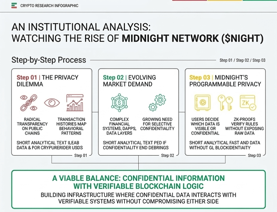 Di sinilah konsep yang lebih luas dari Midnight mulai menonjol. Proyek ini mengeksplorasi apa yang semakin disebut pengembang sebagai privasi yang dapat diprogram. Alih-alih menyembunyikan semua informasi sepenuhnya, idenya adalah memberikan pengguna dan aplikasi kemampuan untuk memutuskan data mana yang menjadi terlihat dan mana yang tetap rahasia. Dalam istilah praktis, itu berarti transaksi atau interaksi kontrak dapat membuktikan bahwa aturan tertentu telah dipenuhi tanpa mengungkapkan data mentah di baliknya. Sistem seperti ini sering bergantung pada alat kriptografi canggih seperti bukti pengetahuan nol, yang memungkinkan satu pihak membuktikan sesuatu adalah benar tanpa mengungkapkan informasi yang mendasarinya. Jika desain itu berhasil pada skala besar, itu menciptakan titik tengah di mana kerahasiaan dan logika blockchain yang dapat diverifikasi dapat ada bersama-sama. Bagi para pelaku pasar, alasan mengapa konsep ini terus kembali cukup sederhana. Jaringan blockchain sedang berkembang dari sekadar transfer token sederhana menjadi sistem keuangan yang lebih kompleks, aplikasi terdesentralisasi, dan lapisan koordinasi data. Seiring pertumbuhan sistem tersebut, permintaan akan kerahasiaan selektif tumbuh bersamanya. Perusahaan yang mengeksplorasi infrastruktur terdesentralisasi sering perlu melindungi operasi keuangan internal. Pengembang yang membangun alat keuangan mungkin memerlukan cara yang ramah kepatuhan untuk menangani data sensitif. Bahkan pengguna individu semakin menyadari bahwa transparansi permanen tidak selalu ideal untuk aktivitas ekonomi rutin. Ambisi lebih luas Midnight tampaknya berputar di sekitar pembangunan infrastruktur di mana informasi rahasia dapat berinteraksi dengan sistem blockchain yang dapat diverifikasi tanpa mengorbankan kedua sisi.