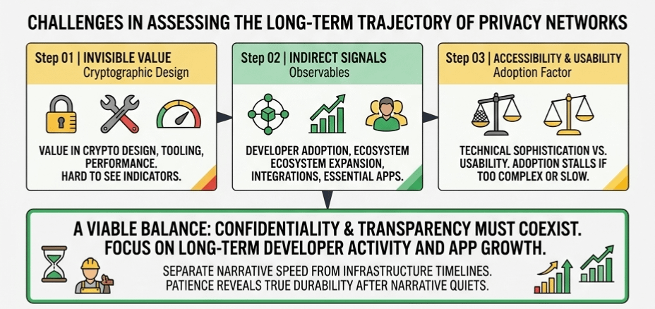 Di situlah evaluasi infrastruktur privasi menjadi sulit. Banyak nilai nyata terletak di dalam desain kriptografi, alat pengembang, dan kinerja sistem daripada indikator pasar yang terlihat jelas. Trader yang melihat dari luar jarang melihat detail tersebut secara langsung. Sebaliknya, mereka bergantung pada sinyal tidak langsung: adopsi pengembang, ekspansi ekosistem, integrasi dengan protokol lain, dan apakah aplikasi mulai muncul yang bergantung pada teknologi tersebut. Seiring waktu, sinyal-sinyal tersebut biasanya mengungkapkan lebih banyak tentang lintasan jangka panjang proyek daripada kegembiraan naratif awal. Tantangan lain bagi infrastruktur privasi adalah menyeimbangkan kecanggihan teknis dengan kemudahan penggunaan. Sistem kriptografi yang canggih dapat membuka kemampuan yang kuat, tetapi mereka juga memperkenalkan kompleksitas. Jika sistem tersebut menjadi terlalu sulit bagi pengembang untuk diimplementasikan atau terlalu lambat untuk aplikasi praktis, adopsi sering kali terhambat. Proyek infrastruktur yang berhasil dalam jangka panjang biasanya mencapai tahap di mana pengembang dapat membangun aplikasi tanpa perlu memahami setiap mekanisme kriptografi di belakang layar. Apakah Midnight dapat mencapai tingkat aksesibilitas itu adalah sesuatu yang kemungkinan akan diperhatikan oleh pasar saat ekosistem berkembang.