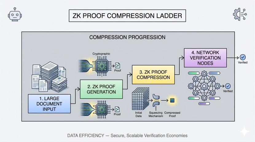 A multi-megabyte document might produce a proof only a few kilobytes in size. The network verifies the smaller artifact while the full dataset remains outside the ledger.