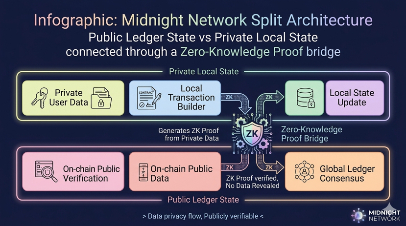 Public state remains visible to the blockchain and participates in consensus. Private state stays local to the participants interacting with the application. When a transaction occurs, the computation involving sensitive information happens outside the chain entirely.